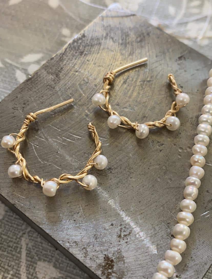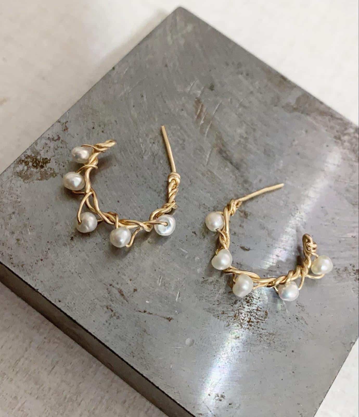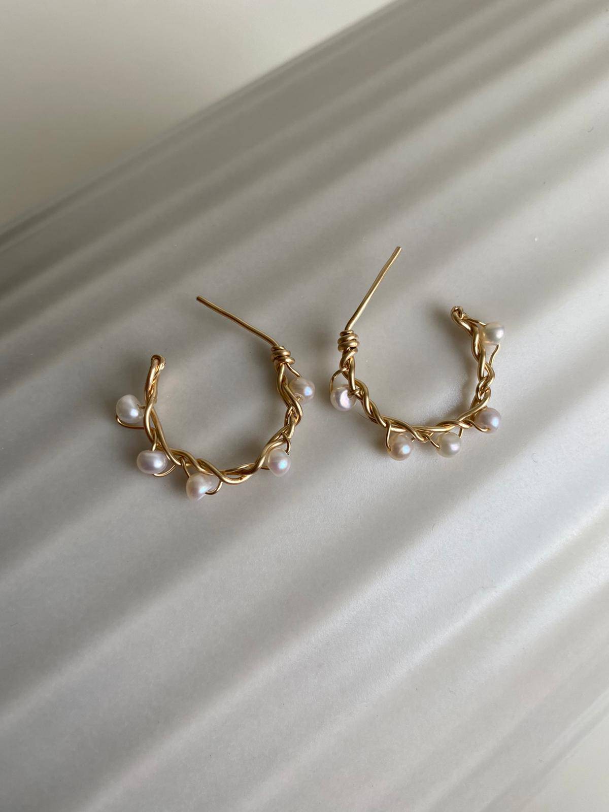 עגילי חישוק בעבודת יד שבהם שזורים פנינים טבעיות למראה וינטג׳ קלאסי.